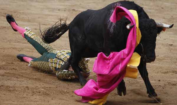 Para Matador dari Spanyol melakukan aksi dalam adu banteng di Mexico City, Mexico, Minggu (26/8). Aksi nekat para matador yang kerap membahayakan mulai dari diseruduk, terinjak banteng hingga luka, semata-mata untuk menghibur para penonton yang datang ke arena tersebut.